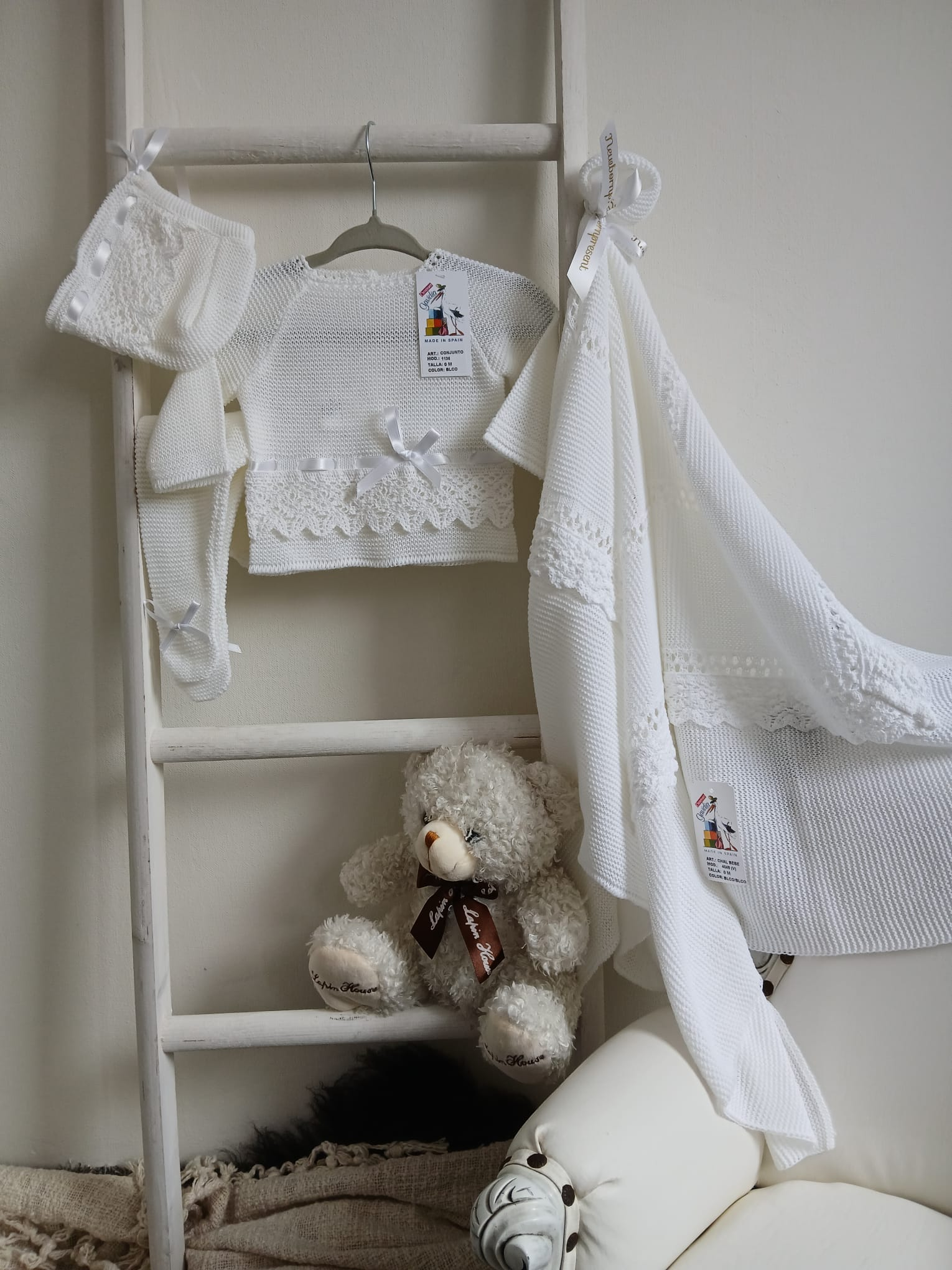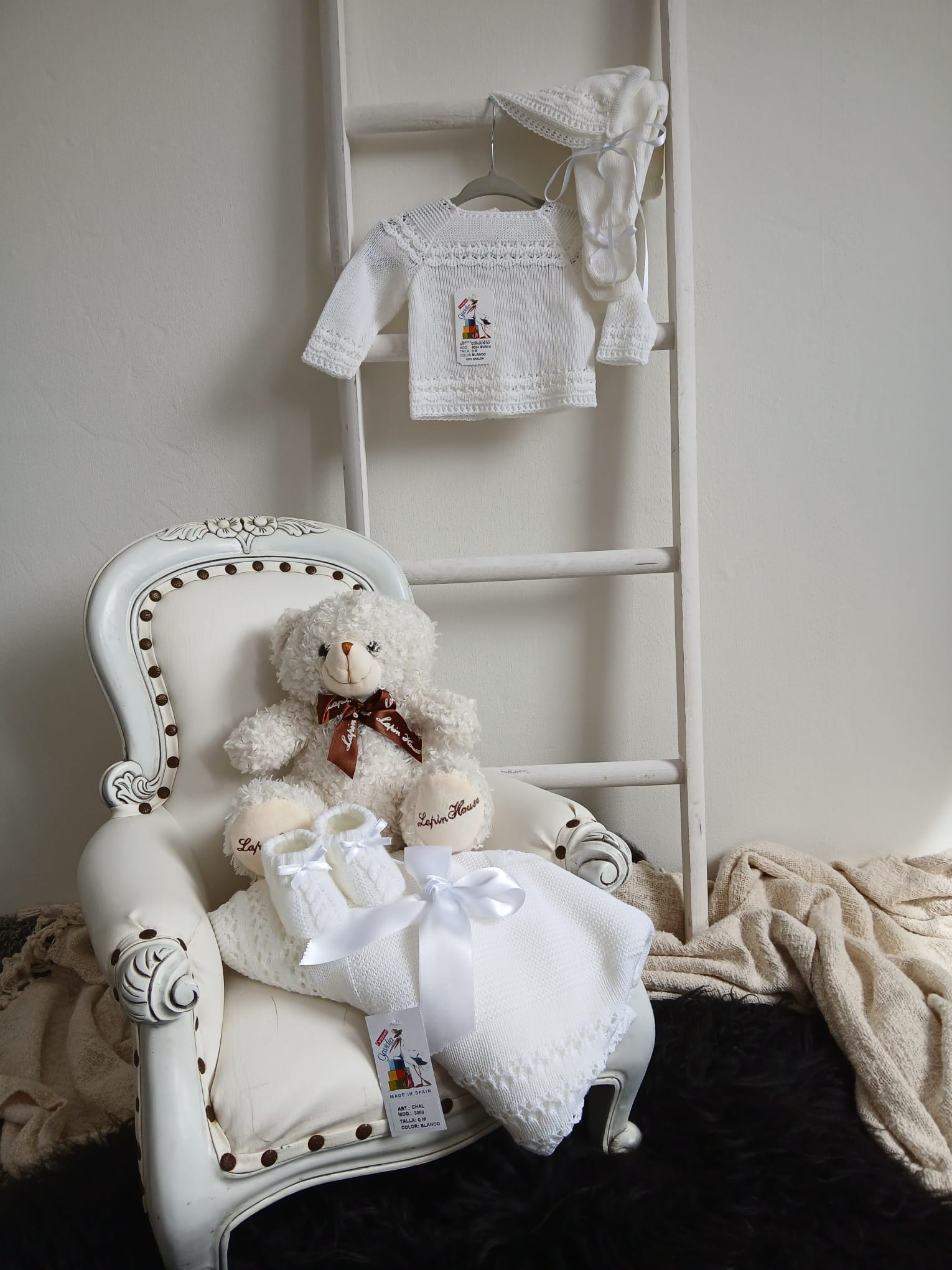 Gavedia, een bijzonder merk uit Spanje, staat garant voor 100% katoenen kledingstukken die met zorg en aandacht zijn vervaardigd. De fris witte en off-white tinten geven de collectie een tijdloze elegantie die perfect past bij pasgeborenen. Bijpassende omslagdoeken maken de outfit compleet.